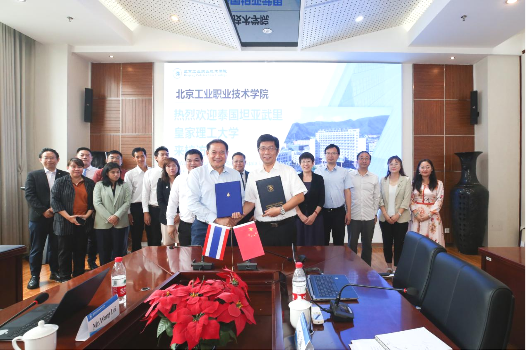 安江英院長和Dr.Sommai校長現場簽署了《北京工業職業技術學院與泰國坦亞武里皇家理工大學兩校合作諒解備忘錄》。隨后,雙方就理工類專業開展學生培養、學生短期實習、訪問學者等事宜進一步交換了意見,達成初步合作意向。周燕副院長表達了對兩校國際交流合作部門增進溝通,建立合作機制的希望。