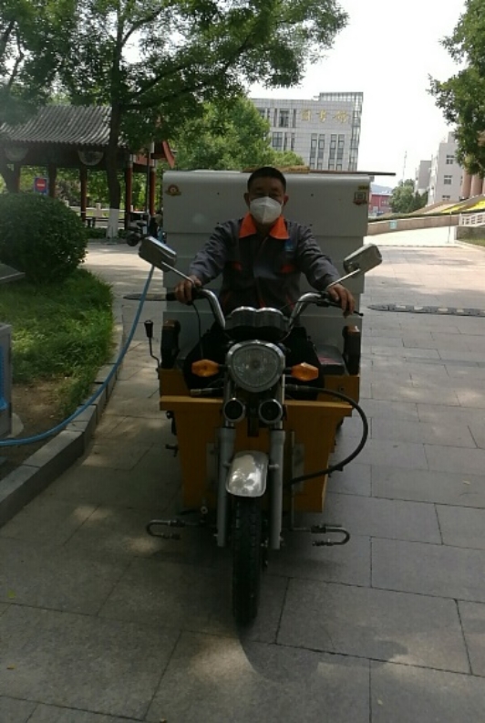 因?yàn)橐咔槎裢饫淝宓男@里,總有幾個(gè)頻繁往來(lái)于各處勞作的身影,他們是校園管理中心的室外環(huán)衛(wèi)合同工們。防疫期間,學(xué)校共有5名環(huán)衛(wèi)員工堅(jiān)守一線(xiàn)崗位,清運(yùn)垃圾、打掃主路、遞送消毒物資、對(duì)校園的外環(huán)境進(jìn)行保潔。室外的每一個(gè)垃圾桶的清理、每一條道路的清潔都離不了室外環(huán)衛(wèi)合同工們加班加點(diǎn)的辛苦勞作。