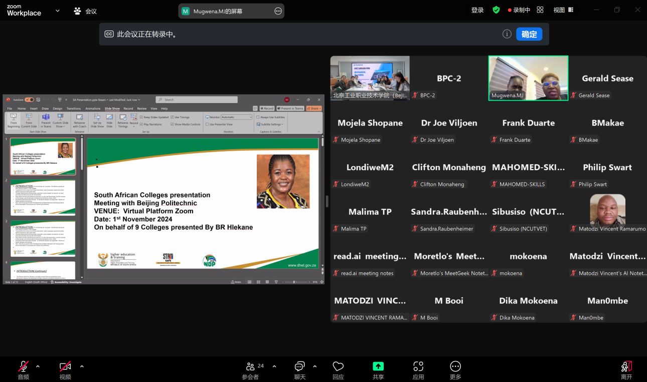 11月1日下午,我校與南非職業院校召開南非培訓項目線上對接會,就北工院與南非高教部已簽署的諒解備忘錄細節及南非培訓項目的重要事宜進行了充分溝通與討論,旨在促進雙方在職業教育與技術培訓領域的進一步合作,確保南非培訓團來校培訓工作有序推進。我校黨委常委、副院長周燕出席會議。與我校簽署合作協議的9所南非高職院校代表共計24人線上出席會議。