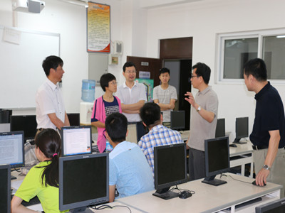 我院第六屆數學建模競賽正在綜合樓8層機房火熱進行,副校長劉蘭明、基礎教育學院院長胡喜平、黨總支書記梁文學、教學副院長王佼等蒞臨比賽現場。