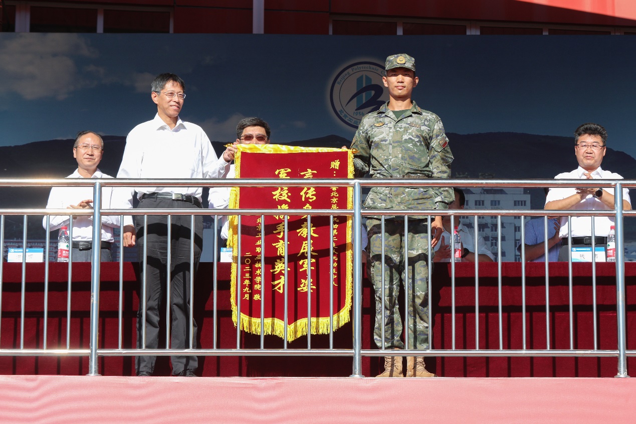 本次軍訓,同學們磨練了意志,錘煉了品質,提高了身體素質,這一切都離不開部隊領導的重視和教官的辛勤付出,為表達我校真摯的感謝,校黨委書記高喜軍向軍訓官兵贈送錦旗。