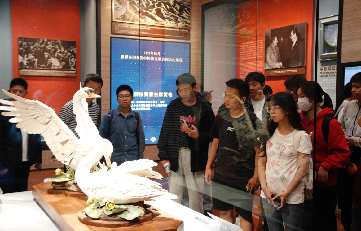 同學們在工作人員繪聲繪色的講解下,仔細觀看一件件獨具特色的外交禮品、一份份珍貴的文字材料,真切領略到 “一國一物一風情”。大家被富有特色的禮品文物深深吸引,每一份珍貴文件資料都引發大家駐足思考,沉浸于新中國外交歷程的探索中