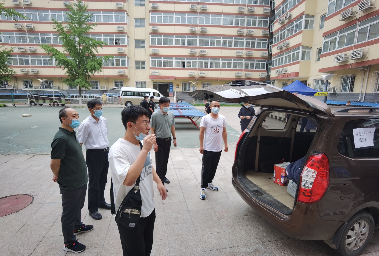 高喜軍書記、安江英院長、魏曉東副書記分別到學(xué)生寢室,看望行李打包的學(xué)生和班主任。詢問了畢業(yè)生就業(yè)情況,親切慰問了幫助學(xué)生收拾、托運(yùn)行李的班主任。