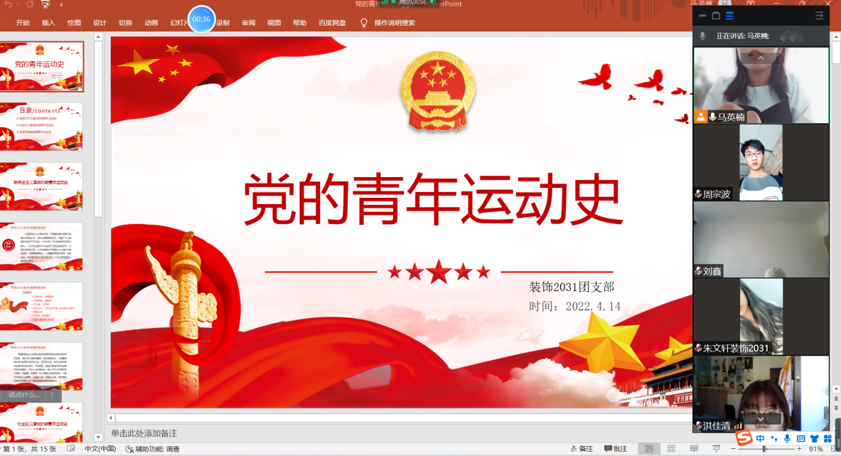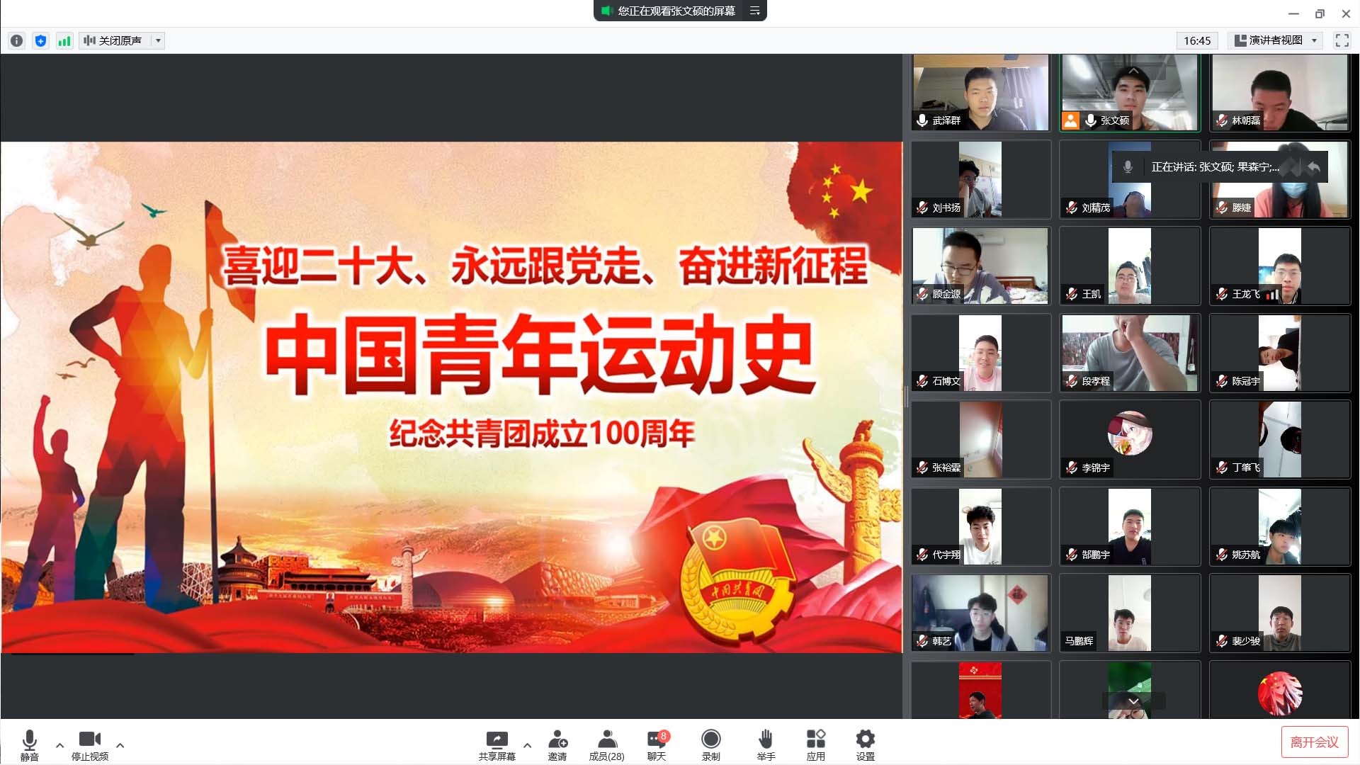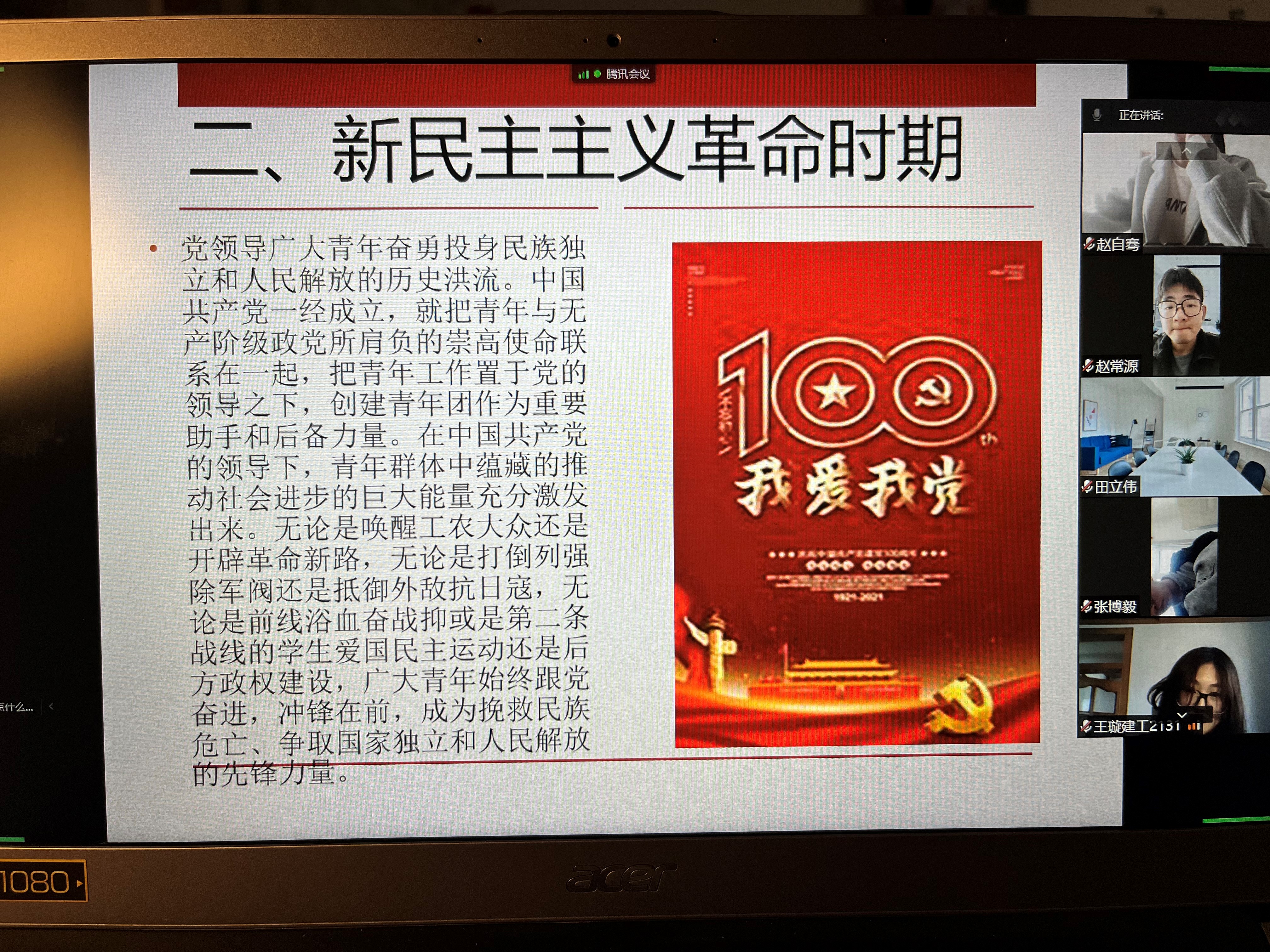 在此次專題學習活動中,各團支部根據防疫工作實際,貫徹落實疫情防控要求,在線上圍繞“黨的青年運動史”主題,以觀看視頻、專題發言、集體討論等形式展開學習。同學們更加深刻了解了百年來無數青年在黨的領導下所做出的杰出貢獻,深切感受到了這一段艱辛而光輝的發展歷程。