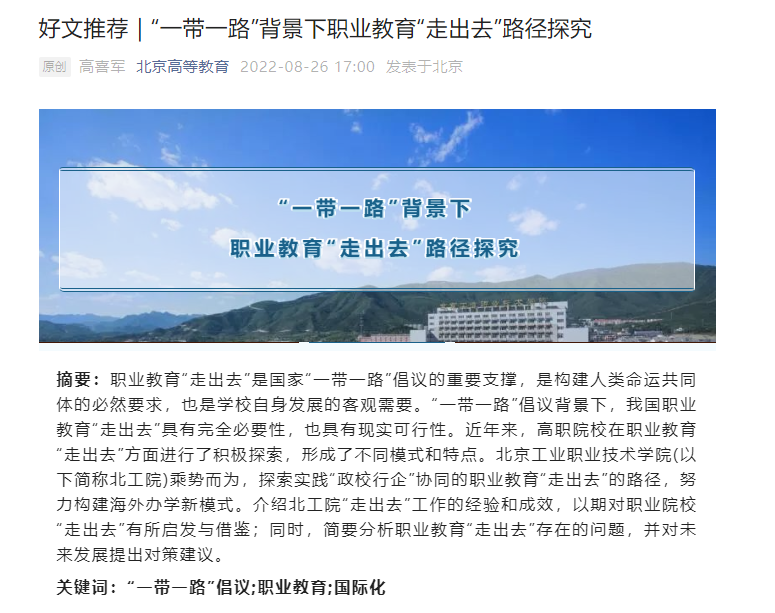 《北京教育》(高教)2022年第8期高教研究【書記·校長思享錄】欄目刊發了我校黨委書記高喜軍文章《“一帶一路”背景下職業教育“走出去”路徑探究》。