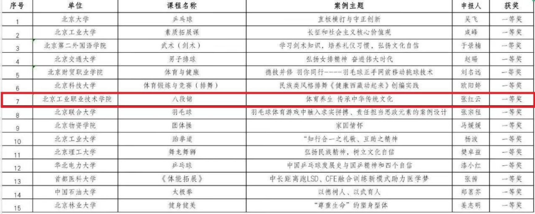 其中,張紅云負(fù)責(zé)的八段錦團(tuán)隊《體育養(yǎng)生 傳承中華傳統(tǒng)文化》課程思政教學(xué)案例榮獲一等獎、李桂英負(fù)責(zé)的動感單車團(tuán)隊《體能與職業(yè)素養(yǎng)并進(jìn)》課程榮獲二等獎,王勇、賈一、李玉超負(fù)責(zé)的團(tuán)隊教學(xué)案例分別榮獲三等獎。在取得團(tuán)隊殊榮的同時,我校也從眾多首都高校中脫穎而出,榮獲首都高等學(xué)校第一屆體育課程思政教學(xué)案例征集工作“優(yōu)秀組織獎”。