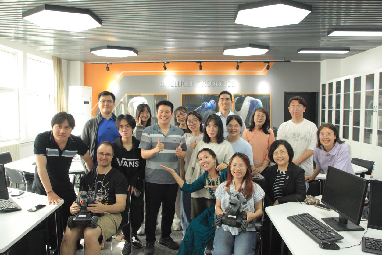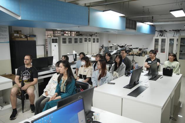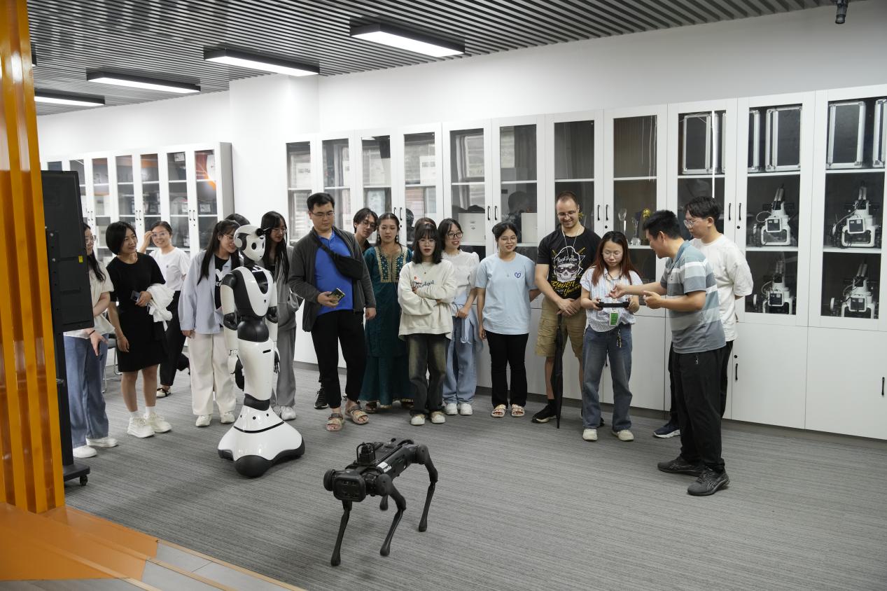 在善技樓110教室,機(jī)電工程學(xué)院黃歡老師為國(guó)際學(xué)生們教授了智能機(jī)器人課程,介紹了生活中的人型機(jī)器人、機(jī)器狗和掃地機(jī)器人等智能機(jī)器人類(lèi)型,以及智能機(jī)器人的感知技術(shù)和自我決策能力等,并在助教老師的協(xié)助下,向國(guó)際學(xué)生們展示了各類(lèi)智能機(jī)器人的實(shí)際運(yùn)行和操作。同學(xué)們都積極踴躍地參與到課程學(xué)習(xí)和實(shí)操互動(dòng)當(dāng)中,比如操作機(jī)器狗完成“后空翻”動(dòng)作、與人型機(jī)器人玩笑對(duì)話(huà)、在“You raise me up”的優(yōu)美歌聲中同機(jī)器人一起跳舞等,課堂氣氛非常活躍。