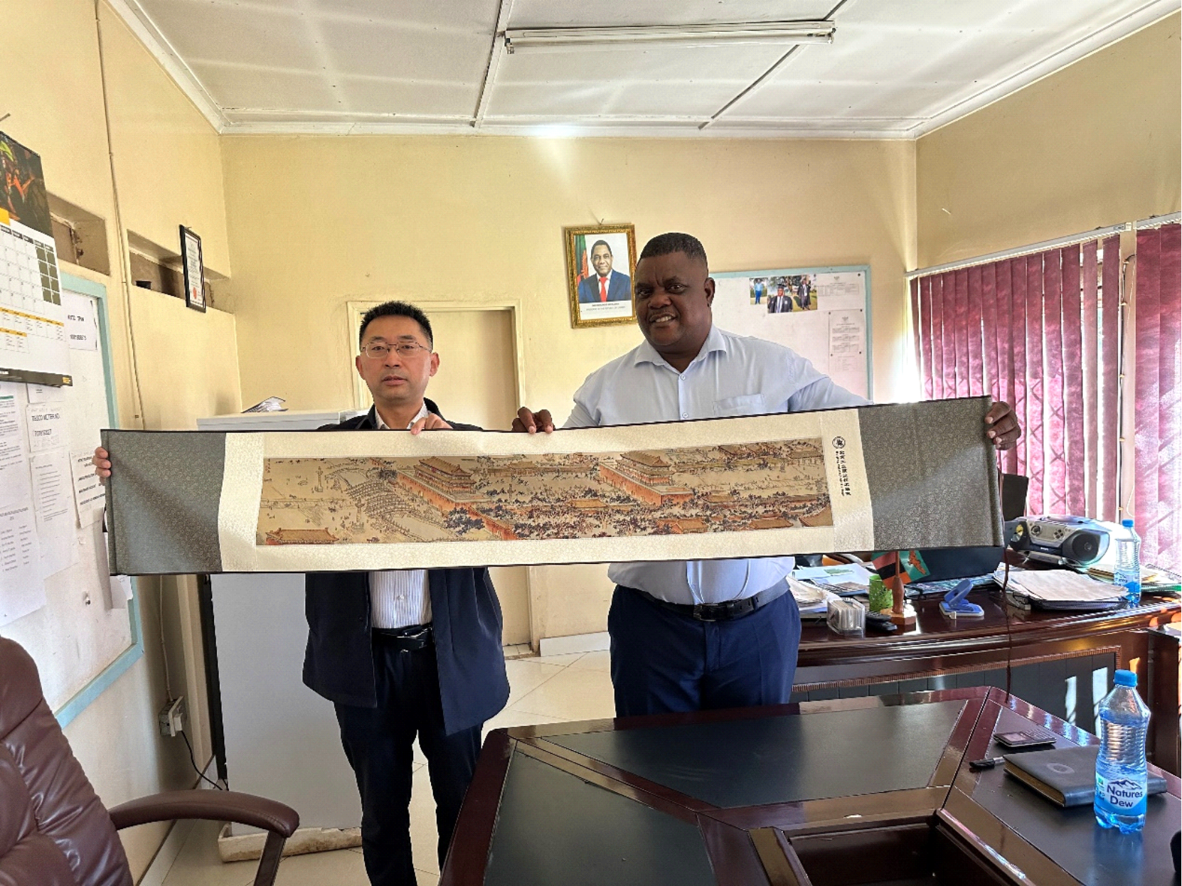 團組最后走訪了贊比亞大學孔子學院。外派教師張喜芹代表中方院長詳細介紹了孔子學院的建設情況和中文教學的開展情況。我校中贊職院分院院長兼孔子課堂負責人馬雋也向對方介紹了中贊職院孔子課堂的建設情況及未來的工作計劃。雙方就如何進一步推廣中文教育、加強文化交流等方面進行了深入交流。