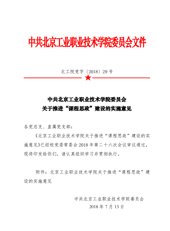 長期以來,北京工業職業技術學院緊緊圍繞人才培養根本任務,堅持立德樹人,把思想政治教育貫穿人才培養體系,全面推進課程思政內涵建設,緊緊抓住教師隊伍“主力軍”、課程建設“主戰場”、課堂教學“主渠道”,將思想政治教育“無痕”融入課程教學,探索課程思政教學改革特色做法和成功經驗,課程思政教學改革取得了較好成效。 北京工業職業技術學院圍繞全面提高人才培養能力這一核心環節,建立黨委統一領導、黨政齊抓共管、全員協同聯動、學院(部)落實推進的課程思政建設工作機制。課程思政作為落實立德樹人根本性舉措被納入到人才培養方案、專業建設方案、課程標準和教師教案中,著力培養德智體美勞全面發展的社會主義建設者和接班人。