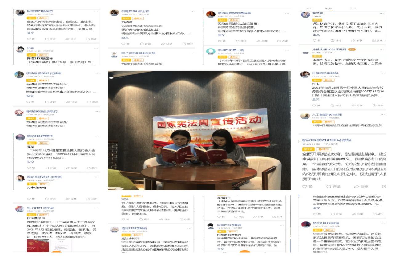 本次宣傳周活動(dòng)主要內(nèi)容有宣傳習(xí)近平法治思想、宣傳百年黨史、宣傳黨的十九屆六中全會(huì)精神、宣傳《中華人民共和國(guó)憲法》、宣傳《中華人民共和國(guó)民法典》、宣傳冬奧會(huì)冬殘奧會(huì)相關(guān)法律法規(guī)、宣傳北京市“八五”普法規(guī)劃等七部分。活動(dòng)期間,學(xué)校各黨總支結(jié)合實(shí)際開(kāi)展了憲法進(jìn)校園、進(jìn)課堂等宣傳教育活動(dòng),進(jìn)一步提升了法治校園的氛圍。文法與管理學(xué)院黨總支還組織全校師生通過(guò)“憲法晨讀”、“憲法手抄報(bào)比賽”和“學(xué)憲法講憲法視頻制作”等系列活動(dòng),線上線下齊參與,弘揚(yáng)憲法精神,筑夢(mèng)法治校園。
