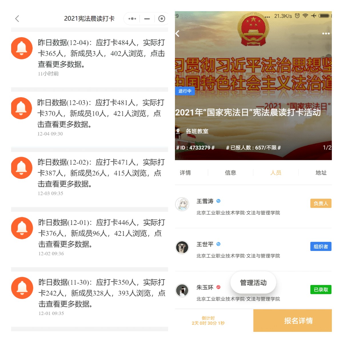 文法與管理學(xué)院懿來(lái)讀書(shū)社負(fù)責(zé)登錄校團(tuán)委打卡平臺(tái),為同學(xué)們參加活動(dòng)發(fā)放學(xué)習(xí)積分,激勵(lì)同學(xué)們參與到第二課堂法治宣傳教育中來(lái)。11月29-12月5日憲法宣傳周活動(dòng)期間,共有來(lái)自全校4個(gè)學(xué)院657名同學(xué)參與到憲法晨讀打卡學(xué)習(xí)中,累計(jì)打卡1740次。