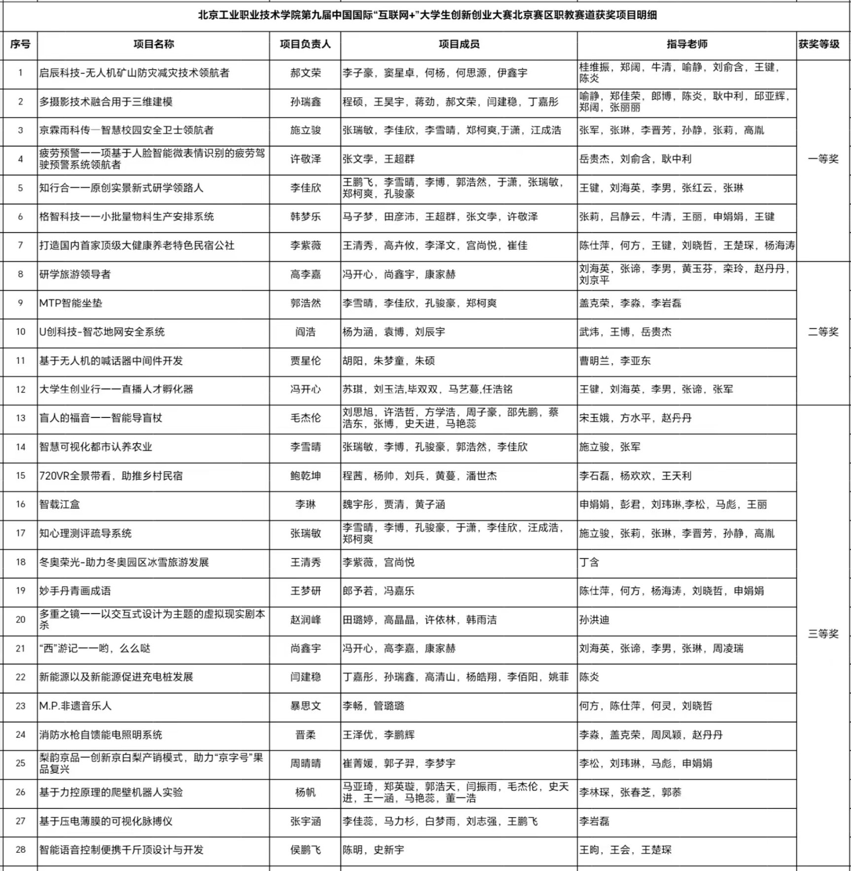 第九屆中國國際“互聯(lián)網(wǎng)+”大學生創(chuàng)新創(chuàng)業(yè)大賽北京賽區(qū)職教賽道總決賽于近日結(jié)束,我校在本屆大賽中榮獲一等獎7項、二等獎5項、三等獎16項。據(jù)本屆大賽獲獎數(shù)據(jù)統(tǒng)計,我校進入20強排位賽及獲一等獎項目數(shù)在全市高職院校中排名第一。