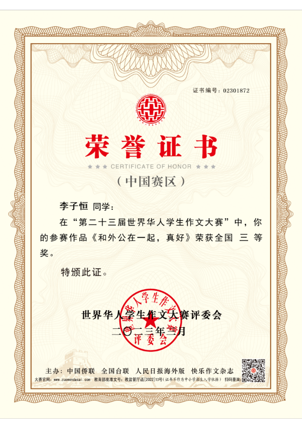 李子恒、侯子木、隗琳琳三名同學(xué)在中國(guó)僑聯(lián)、全國(guó)臺(tái)聯(lián)舉辦的“第二十三屆世界華人學(xué)生作文大賽”中榮獲全國(guó)三等獎(jiǎng)。