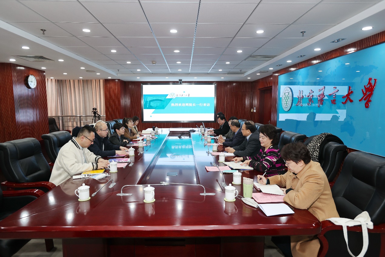 魏暉副書記對周燕副院長一行的到來表示熱烈歡迎,并簡要介紹了北京語言大學的歷史沿革、發展現狀以及在人才培養、教育教學、科學研究、師資隊伍等方面的經驗與成績。他談到,北京語言大學是一所以國際中文教育為特色,以語言教育和研究為優勢的綜合性大學,其在漢語國際教育領域已形成了品牌優勢和世界影響力。隨著社會對國際中文人才的需求不斷發生變化,我們當下一大重要任務就是適應這種人才發展新需求,“中文+職業技能”是我們國際中文教育轉型升級的重要方向,實現國際中文教育與職業教育融合發展,將成為拓展國際中文應用領域的重要途徑。