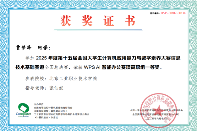 經過兩天的緊張比拼,我校學子憑借扎實的專業功底與出色的臨場發揮,在賽場上大放異彩。賈夢澤、蔡煒兩位同學摘得個人一等獎;宗浩宇、申恪等14名同學獲個人二等獎;宋伊諾、唱煥林等14名同學獲個人三等獎。同時,我校團隊以優異成績斬獲信息技術與素養賽項高職組團體一等獎、人工智能應用基礎賽項高職組團體二等獎,以及WPS AI智能辦公、Microsoft Office智能辦公賽項高職組團體三等獎,充分展現了我校學子良好的精神風貌與過硬的綜合實力。