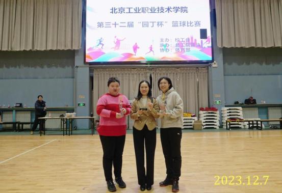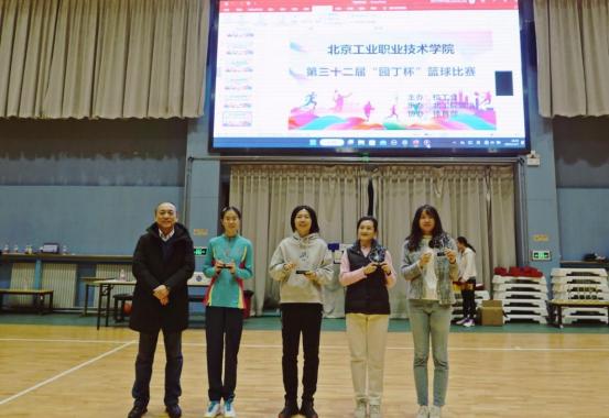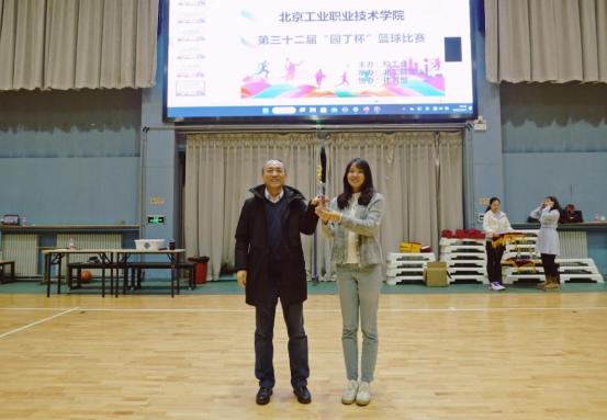 后勤基建處副處長、籃協(xié)主席劉勝厚為團體季軍教學一隊女隊、管理一隊女隊頒獎
