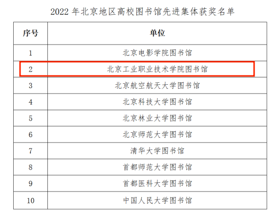 會議表彰了先進集體10個、優秀館長10名及優秀館員103名。我校圖書館被評為“2022年北京地區高校圖書館先進集體”,是10所獲先進集體高校圖書館中唯一一所高職院校。