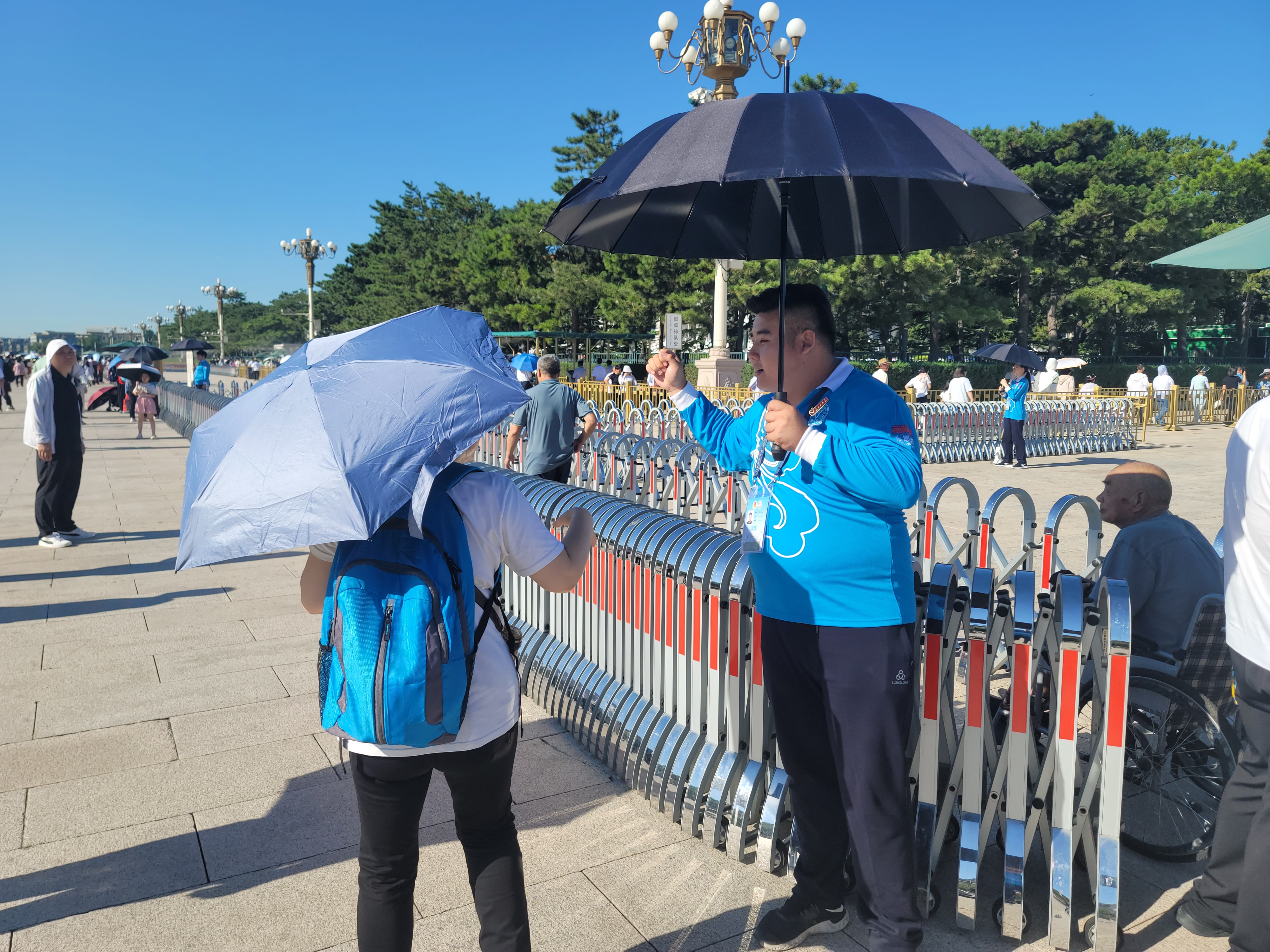 隨著大暑臨近,北京連日高溫,戶外開啟“炙烤模式”,烈日下的天安門廣場(chǎng)地表溫度持續(xù)升高,志愿者們緊張而有序地在團(tuán)隊(duì)預(yù)約崗提供預(yù)約幫助,耐心負(fù)責(zé),答疑解惑,在扶老助殘崗幫助群眾上下樓梯,在外圍崗指引群眾,不畏酷暑,堅(jiān)守崗位,引導(dǎo)大家有序瞻。