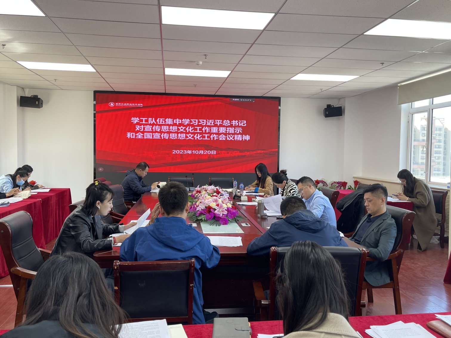 10月20日上午,我校學生工作隊伍在匠心樓716會議室召開專題學習會,深入學習貫徹習近平總書記對宣傳思想文化工作重要指示和全國宣傳思想文化工作會議精神。黨委常委、副院長沈瑩主持會議并講話,學生工作處、團委、各二級學院黨總支副書記及輔導員參加本次學習會。