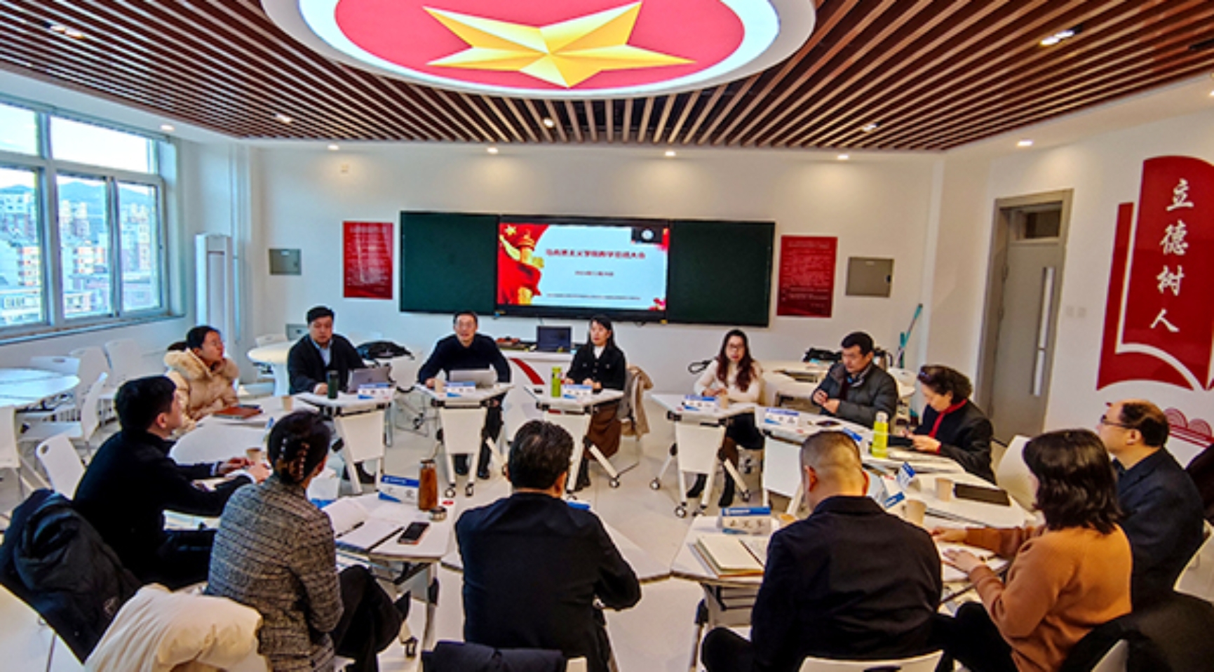 12月26日上午,馬克思主義學院在匠心樓708思政課虛擬仿真教學中心召開思政課教學總結會。學校黨委常委、紀委書記錢偉,黨委常委、副院長沈瑩出席會議,學工部、團委、紀檢監察辦公室等相關部門負責同志參加會議,共同聽取馬克思主義學院和思政課教師工作匯報,就馬克思主義學院建設與發展提出指導性建議,推動思政課教學改革創新,努力提高思政課教學質量。