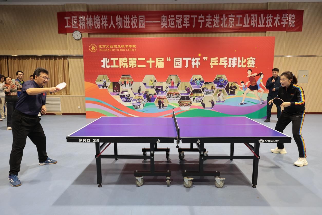 開幕式上,丁寧對北京工業職業技術學院全體師生員工送祝福,希望大家認真工作、努力學習,希望比賽隊員都能夠收獲獎杯,收獲榮譽。比賽正式開始前,錢偉和丁寧為第二十屆“園丁杯”乒乓球比賽開球,獲得滿堂喝彩!