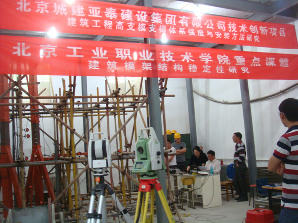 該項目充分體現了校企合作的優勢,對我校教學科研均具有較強的促進作用。本項目結合了我校兩項重點科研項目“建筑模架結構穩定性研究”和“精密工程測量技術應用研究”,以及大學生科研項目“扣件式鋼管支模架穩定承載力研究”,為多項科研課題搭建了平臺。建筑專業學生通過搭建模架架體,掌握了建筑施工規范,懂得了建筑施工安全操作規程。試驗儀器由中國礦業大學(北京)土木學院的李明林、李明洋兩名研究生操作,試驗項目起到培養了研究生的作用。