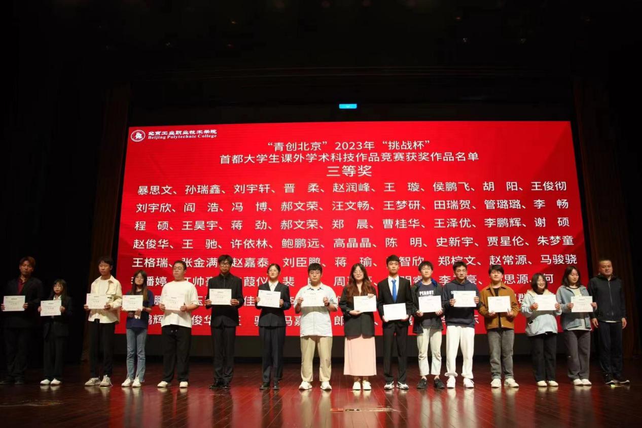 校黨委學生工作部部長梁文學為獲得“青創北京”2023年“挑戰杯”首都大學生課外學術科技作品競賽獲三等獎的團隊代表頒獎
