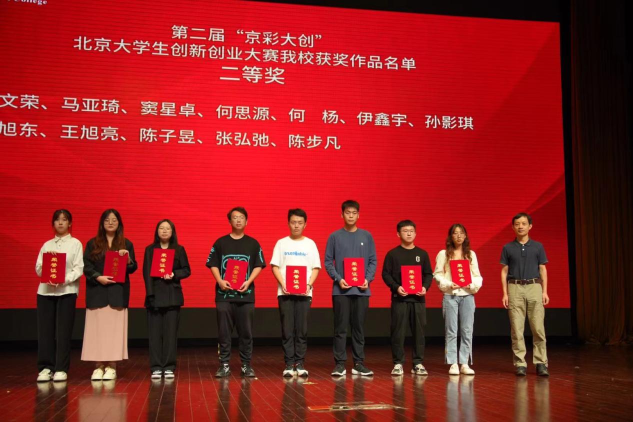 招生就業處副處長郜鳳樓為第二屆“京彩大創”北京大學生創新創業大賽一等獎、二等獎、三等獎的團隊代表頒獎