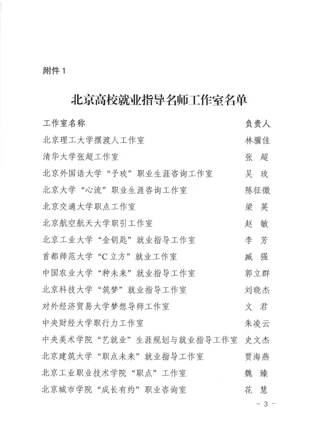 為深入貫徹黨中央、國務院穩就業、保就業的決策部署,進一步提升北京高校畢業生就業指導工作的整體水平,更好地推動北京高校大學生職業生涯發展教育工作,促進大學生全面成長成才。同時,充分發揮社會育人和實踐育人的協同作用,推動高校和社會的就業聯動,打造就業育人共同體,全力促進高校畢業生更充分更高質量就業。根據《北京市“十四五”時期教育改革和發展規劃(2021—2025年)》關于“遴選50個市級就業指導名師工作室”,市教委組織專家對33所高校提交的41份“北京高校就業指導名師工作室申報書”及相關材料逐一查閱審閱、實地調研,確定北京大學、清華大學、首都師范大學等16家工作室為北京地區高校就業指導名師工作室。我校結合實際,積極申報,成功入選,工作室名稱為北京工業職業技術學院“職點”工作室。