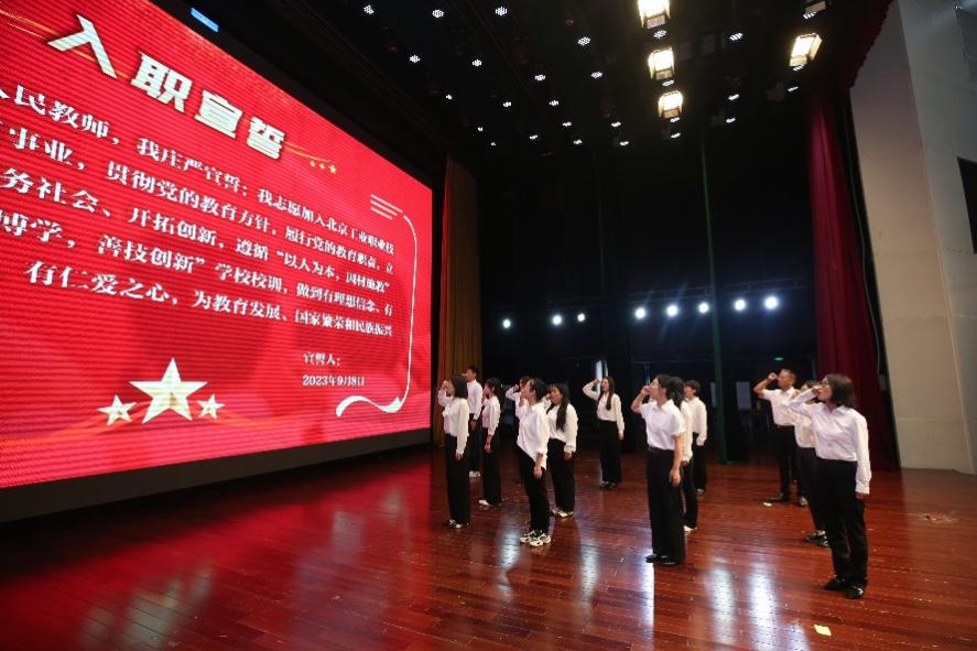 大會(huì)舉行了新教師集體宣誓儀式。在黨委常委、副院長(zhǎng)沈瑩的帶領(lǐng)下全體新教師莊嚴(yán)宣誓,代表著新教師堅(jiān)定投身黨的教育事業(yè)、為培養(yǎng)社會(huì)主義事業(yè)建設(shè)者和接班人而努力奮斗的信念,彰顯了一代代北工院人團(tuán)結(jié)一心、接續(xù)奮斗的決心。新教師代表?xiàng)钣缽?qiáng)發(fā)言。