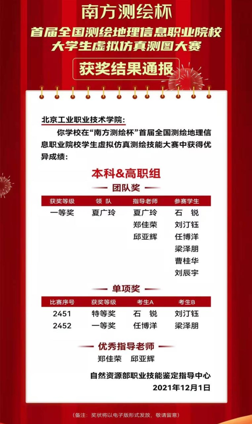 11月25日,“南方測繪杯”首屆全國測繪地理信息職業院校大學生虛擬仿真測圖大賽總決賽在重慶工程職業技術學院開賽,來自全國28個省市近300所高校的1600名選手在線上進行激烈角逐,參賽省市多、院校多、學生多,競爭更加激烈。通過一天的緊張比賽,最終我校獲得特等獎一項、一等獎一項,獲得優秀團隊獎一個。我校是北京參賽5所院校唯一一所獲獎院校。