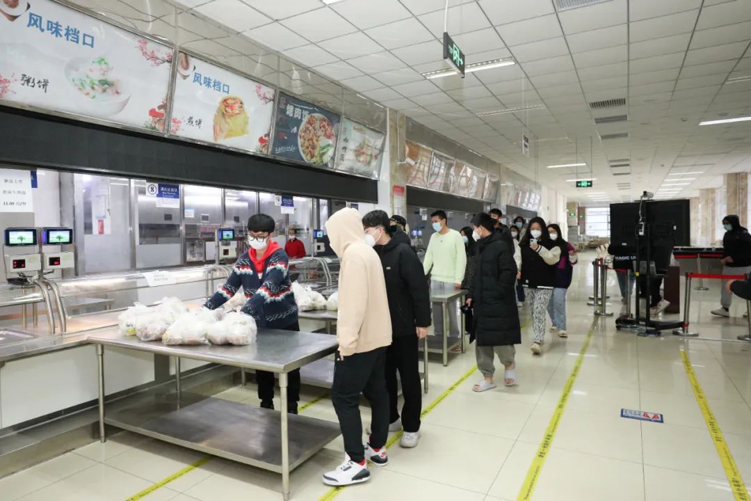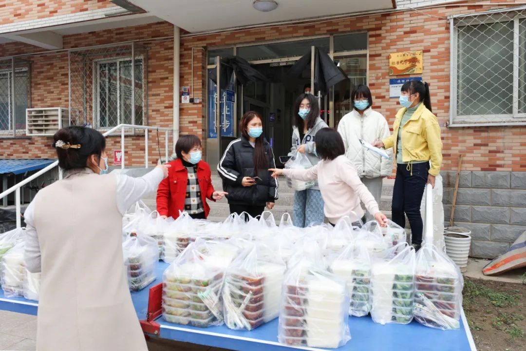 中午12時,4棟學生公寓樓共設置7個分餐點,黨員領導干部帶頭前往學生公寓,為同學們送餐分餐。