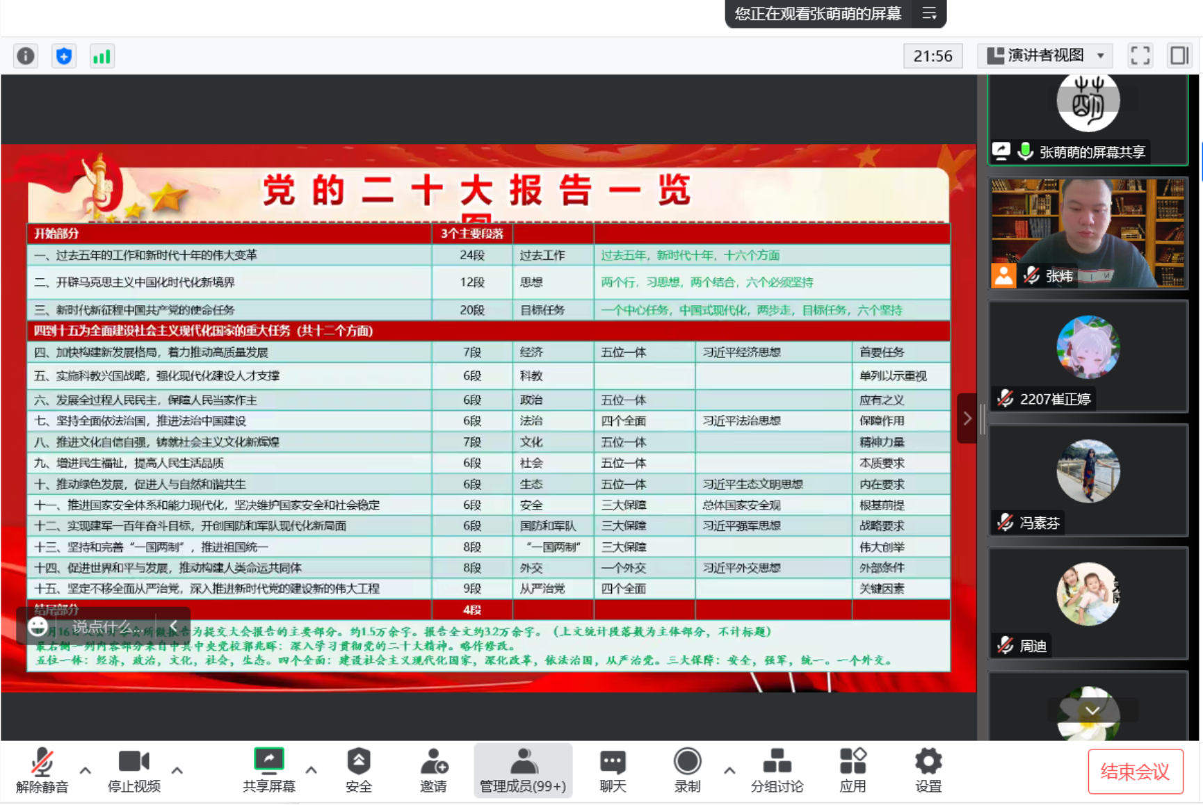 專題報告上,張萌萌書記介紹了黨的二十大的召開背景和黨的二十大精神主題,從六個方面重點闡述了黨的二十大報告的內容。強調,要牢牢把握過去5年工作和新時代10年偉大變革的重大意義;牢牢把握新時代中國特色社會主義思想的世界觀和方法論;牢牢把握以中國式現代化推進中華民族偉大復興的使命任務;牢牢把握以偉大自我革命引領偉大社會革命的重要要求;牢牢把握團結奮斗的時代要求以及黨的二十大報告的其他創新點。