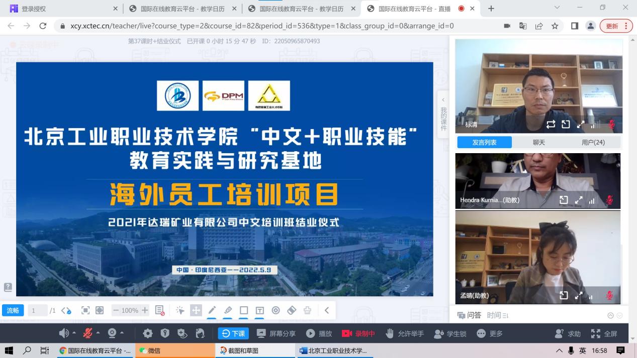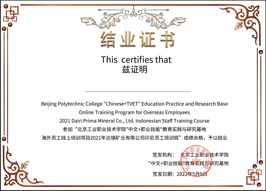 達瑞礦業有限公司中文培訓班開班于2021年11月29日,為期18周。此次培訓,是中國“一帶一路”職業教育合作項目中的一部分,也是我校“中文+職業技能”教育實踐與研究基地的重要任務。培訓項目得到了中國教育部中外語言交流合作中心、北京市政府的大力支持。此次線上中文+職業技能培訓項目是一次新的嘗試,促進了中國與印尼交流和文化融合。不僅提升了受訓學員的中文水平,也增進了學員們對于中國文化的認同和了解,得到了學員們、企業領導們的一致好評。
