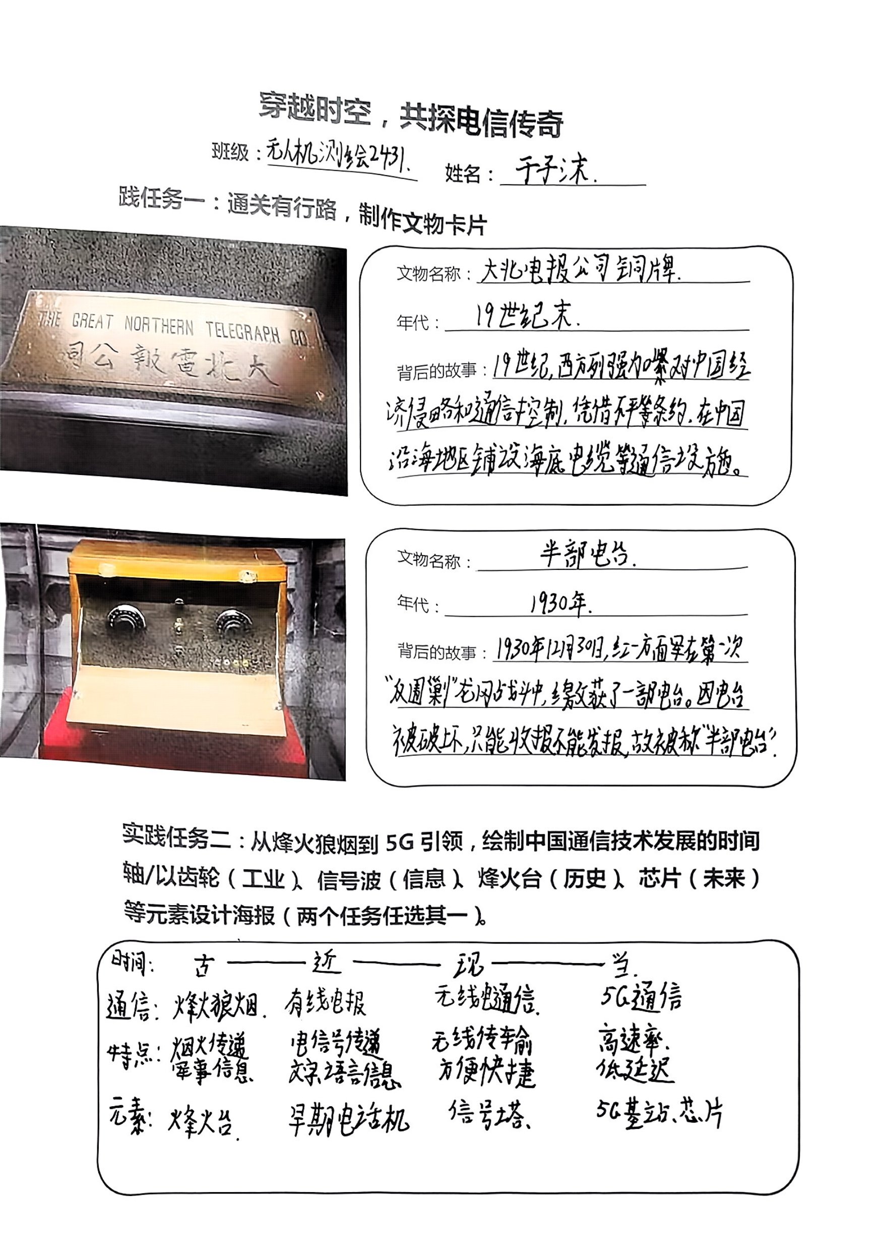 在前期充分調研與集體備課的基礎上,馬院老師精心設計了以 “穿越時空,共探電信傳奇”為主題的實踐手冊。手冊中設置了“通關有行路,制作文物卡片”“繪制中國通信技術發展時間軸”“以齒輪、信息波、烽火臺、芯片等元素設計海報”等任務,引導同學們在觀展中體會電信魅力。