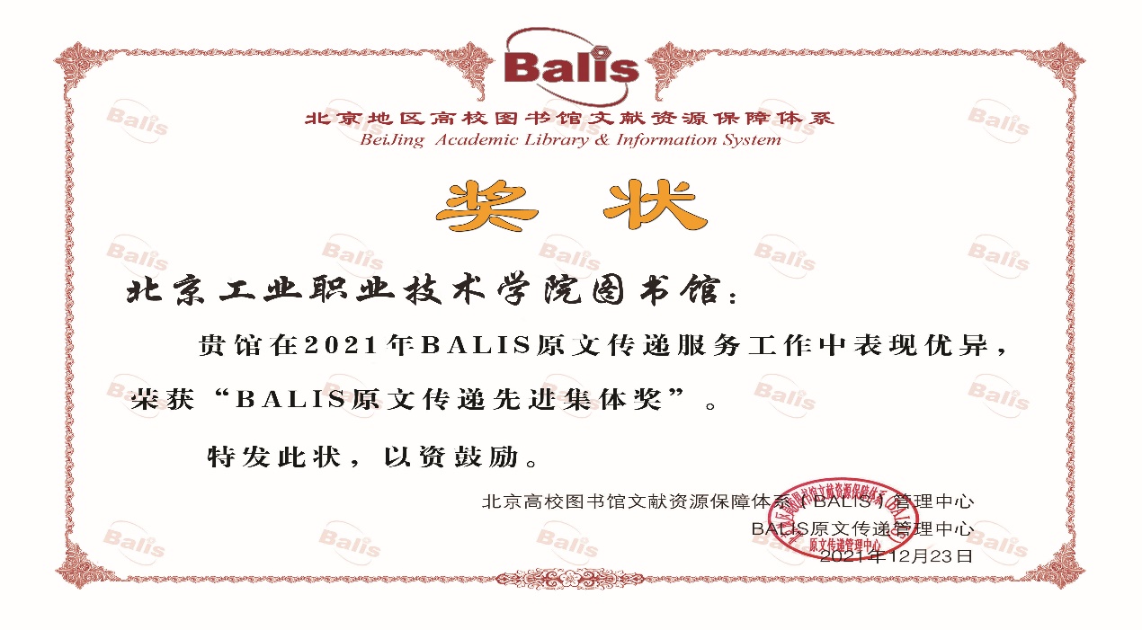 在北京地區82所參評高校圖書館中,我校圖書館綜合排名位列高職類圖書館榜首,榮獲2021年“BALIS原文傳遞先進集體獎”,李瑩老師榮獲BALIS原文傳遞服務工作“先進個人獎”。