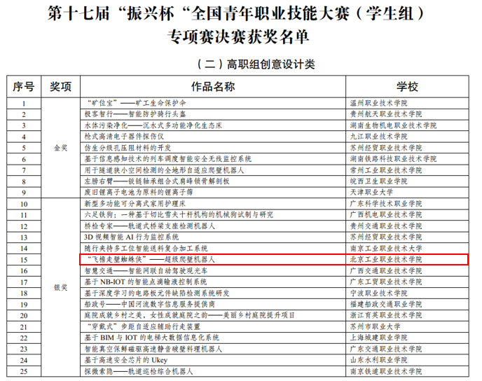 2022年6月27日至28日,由共青團中央、人力資源社會保障部主辦的第十七屆“振興杯”全國青年職業技能大賽(學生組)創新創效專項賽決賽圓滿落下帷幕。共有來自全國25個省份的187件作品入圍。經過激烈角逐,由我校團委組織推薦,機電工程學院教師李林琛、郭菾指導,王旭亮、叢浩然、管騰飛、水恒澤、姚鑫童、馬明宇六名選手的參賽作品《“飛檐走壁蜘蛛俠”——超級爬壁機器人》榮獲高職組創意設計類銀獎,這是我校首次在該項賽事上取得佳績,也是北京代表隊參賽院校中取得的最好成績。