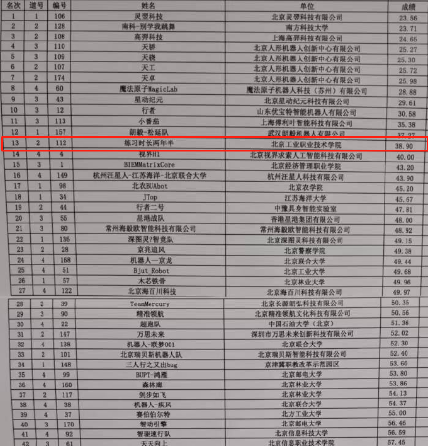 我校信息工程學院孔勇強、李國放老師帶領移動互聯2331班王璐、2431班宗浩宇組成的代表隊,在競爭最為激烈的“人形機器人百米競速賽”中脫穎而出。該賽項吸引了國內外知名高校及機器人企業的90支隊伍參賽,代表了當前人形機器人運動控制領域的最高水準。面對強手如林的賽場,我校參賽機器人以38.9秒的優異成績斬獲全球總排名第13位、國內高校第2位,并在北京市19所高校的51支隊伍中位列第一,充分彰顯了我校在智能裝備研發與工程實踐教學領域的硬核實力。