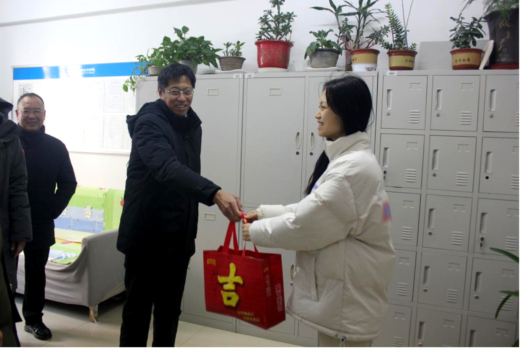 黨委書記高喜軍代表學校黨委向春節期間堅守崗位的值班人員致以親切問候,對大家過去一年來為維護校園安全穩定和服務師生工作生活所付出的辛勤勞動表達誠摯敬意和衷心感謝,向大家發放了春節慰問品并送上新春美好祝福。