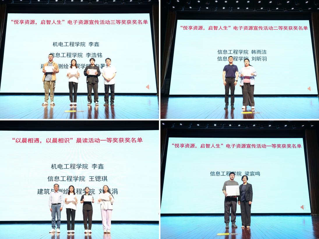 頒獎典禮對讀書月七大活動中表現優異的師生現場頒發榮譽證書和獎品。七大活動分別為時光經典:與文學巨匠對話、跟著《詩經》去春游、“樂享正版,守護創作”——音樂知識產權保護活動、國風動漫:傳承與創新觀影活動、“以晨相遇,以晨相識”晨讀活動、2024年閱讀之星、“悅享資源,啟智人生”電子資源宣傳活動。