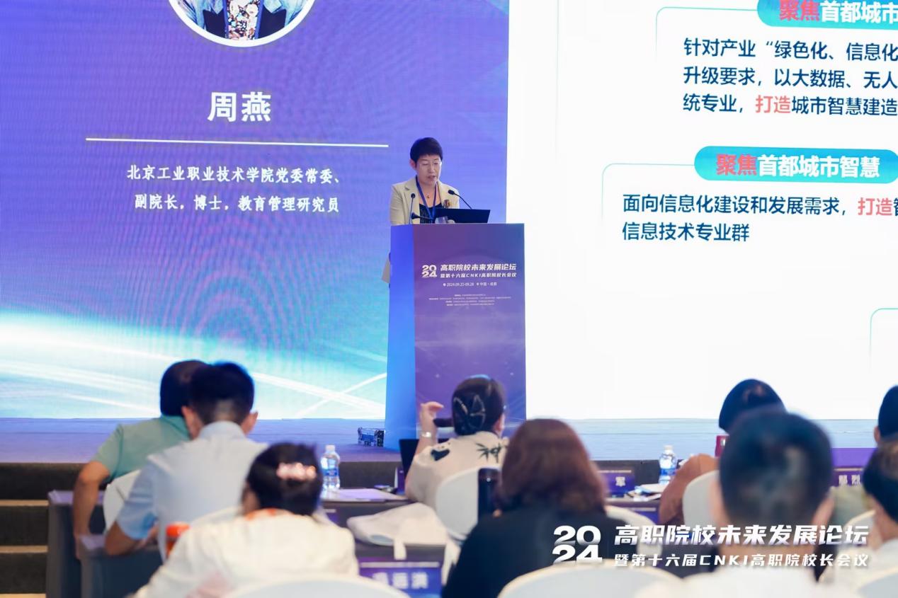 學校黨委常委、副院長周燕代表黨委副書記、院長柳長安做了《深化產教融合校企合作,服務首都高質量發展》的主題發言。周燕副院長從學校基本情況、產教融合校企合作概況、服務首都社會經濟發展等三個方面介紹了我校在職業教育領域的探索、做法和成就。發言邏輯清晰、數據詳實,得到與會嘉賓認可。