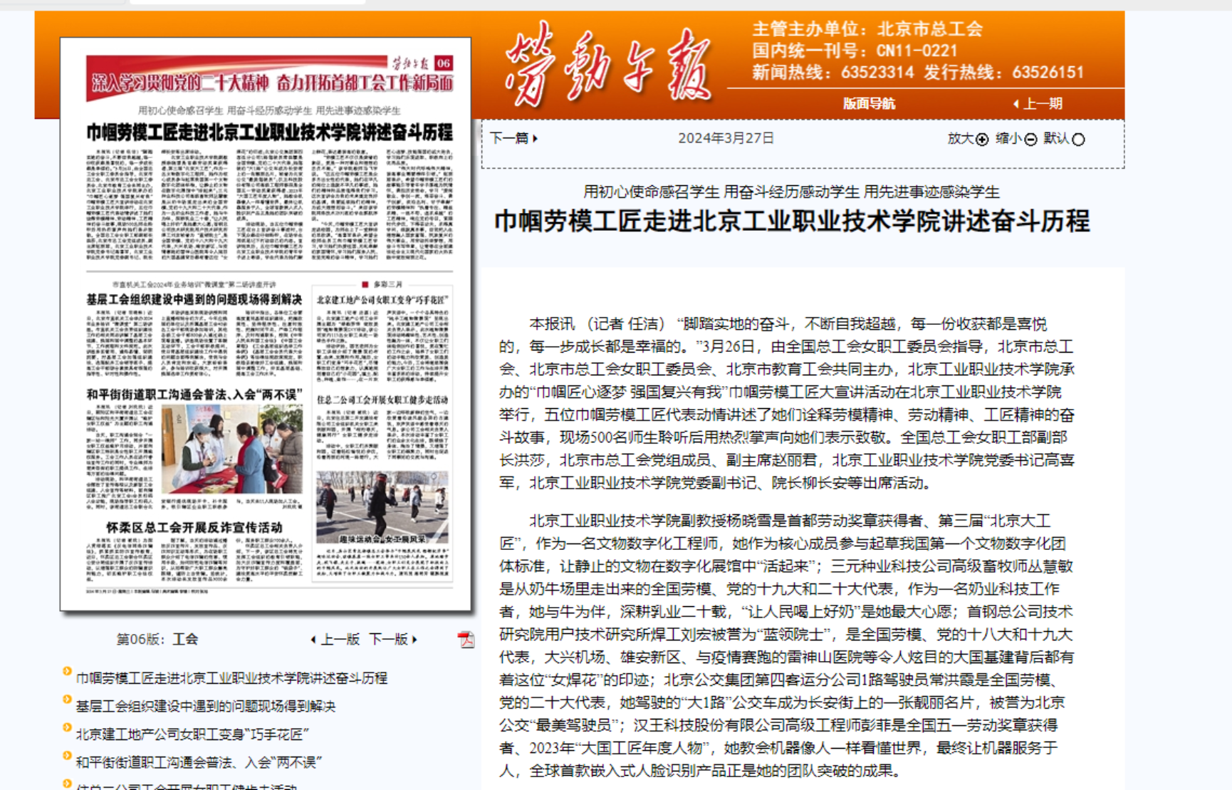 近日,“巾幗匠心逐夢 強國復興有我”巾幗勞模工匠大宣講活動在我校舉行,五位巾幗勞模工匠代表動情講述了她們詮釋勞模精神、勞動精神、工匠精神的奮斗故事,現場600名師生聆聽后用熱烈掌聲向她們表示致敬。《勞動午報》《北京日報》《現代教育報》等媒體紛紛關注報道,學習強國、中工網、今日頭條、北京市總工會官網、財經新聞網等進行了轉載。