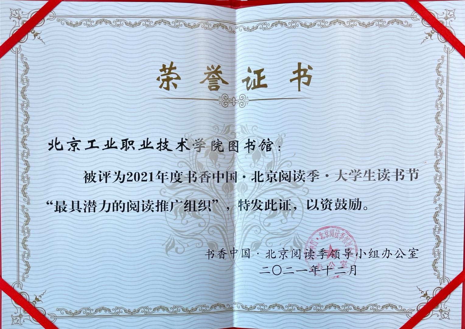 12月19日下午,“書香中國·北京閱讀季·大學生讀書節”總結會在北京圖書大廈報告廳成功舉辦,我校圖書館被評為2021年度書香中國·北京閱讀季·大學生讀書節“最具潛力的閱讀推廣組織”。來自各主辦單位的負責人、知名專家學者和來自全市40余所高校的教師和同學代表出席了活動。
