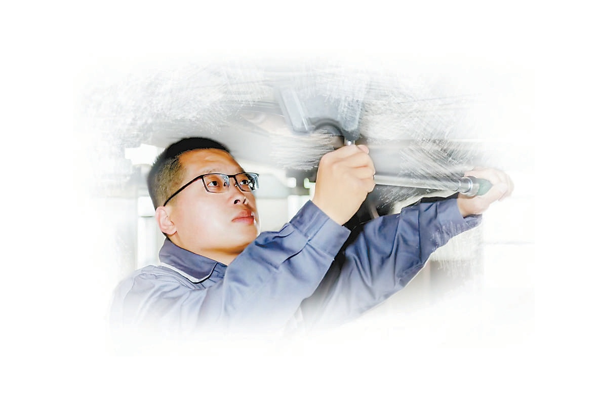 在維修車間里,舉升機將車高高抬起,躬身車底的程旭東用扳手熟練地拆卸著汽車配件。入行12年,憑借一手修車絕活兒,他已讓上萬輛車重新上路。