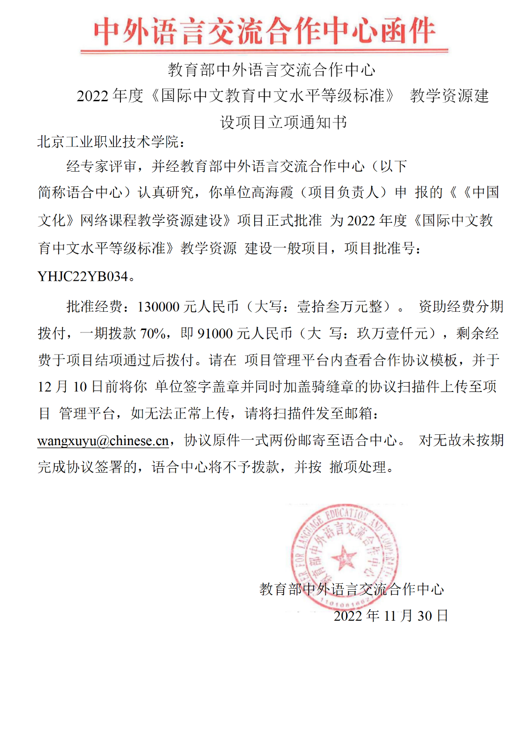 教育部中外語言交流合作中心根據(jù)國際中文教育教學(xué)資源建設(shè)需要,為進一步優(yōu)化教學(xué)資源供給能力,廣泛吸納全球優(yōu)質(zhì)資源,加速打造高質(zhì)量國際中文教學(xué)資源體系,于今年9月,面向全球組織開展2022年度《國際中文教育中文水平等級標準》教學(xué)資源建設(shè)項目申報工作。我校接到通知后,立即啟動了相關(guān)申報工作。